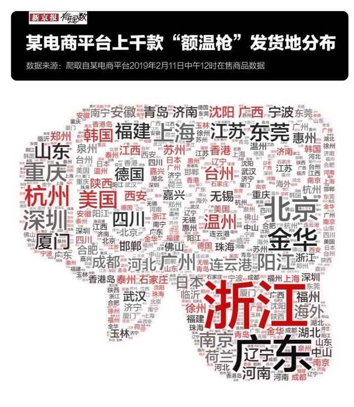 而成品一旦产生,不用担心国内的物流运转速度。通过爬取某电商平台的商品信息,我们发现,额温枪的发货地分布很分散,有广东、浙江、四川、福建等省,也有北京、杭州、重庆、上海、深圳等地,就近发货,节省物流时间,相信需求缺口将很快得到解决。