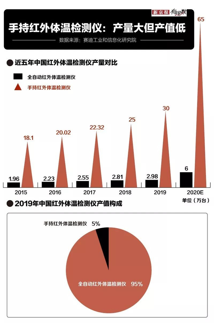 从数据对比来看,“额温枪”的产量比全自动式的要高出许多,产值却很低。也就意味着它的产量大却价格便宜。