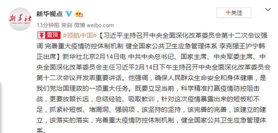 新华社北京2月14日电 中共中央总书记、国家主席、中央军委主席、中央全面深化改革委员会主任习近平2月14日下午主持召开中央全面深化改革委员会第十二次会议并发表重要讲话。他强调,确保人民群众生命安全和身体健康,是我们党治国理政的一项重大任务。既要立足当前,科学精准打赢疫情防控阻击战,更要放眼长远,总结经验、吸取教训,针对这次疫情暴露出来的短板和不足,抓紧补短板、堵漏洞、强弱项,该坚持的坚持,该完善的完善,该建立的建立,该落实的落实,完善重大疫情防控体制机制,健全国家公共卫生应急管理体系。