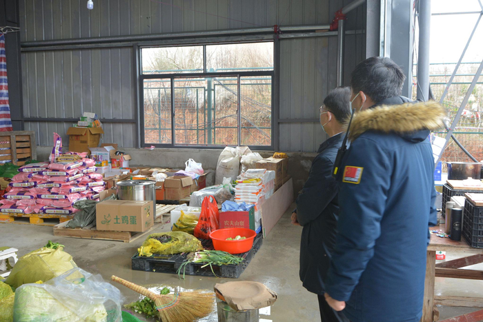 山东蓝天救援队出发时携带了一辆退役的野战餐饮车和两顿蔬菜、肉蛋奶等食材,为整个仓储中心提供餐饮保障。受访者供图