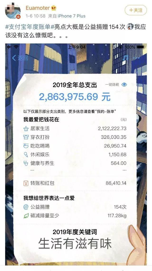 很快,网友发现@Euamoter 曾经公开“晒出”2019年支付宝年度账单,其总支出为286万余元。这又引起网友的猜测和联想,怀疑@Euamoter 利用父亲的权力牟利。