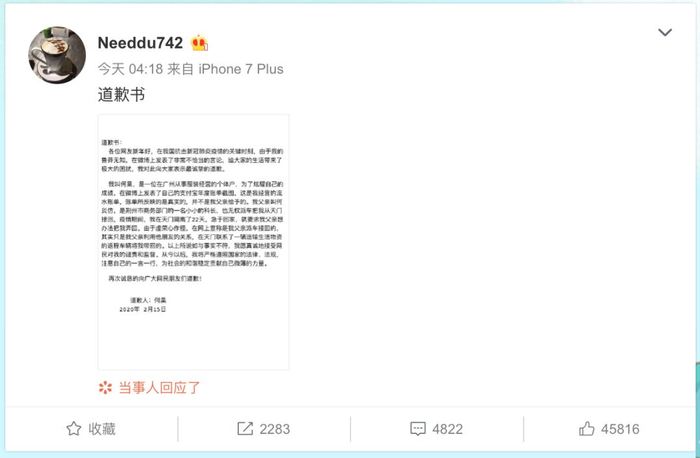 “各位网友新年好,在我国抗击新冠肺炎疫情的关键时刻,由于我的鲁莽无知,在微博上发表了非常不恰当的言论,给大家的生活带来了极大的困扰,我对此向大家表示最诚挚的道歉。