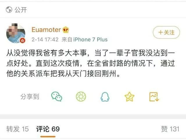 就在刚刚,@荆州发布 通报称,经连夜调查,已证实该微博网民真实姓名何昊,其父何炎仿,系荆州市商务局市场运行科科长。14日,何昊在天门完成规定隔离期后,通过其父何炎仿的私人关系,联系一辆由天门来荆州采购物资的顺风车返回荆州,途中在微博上发表相关言论。