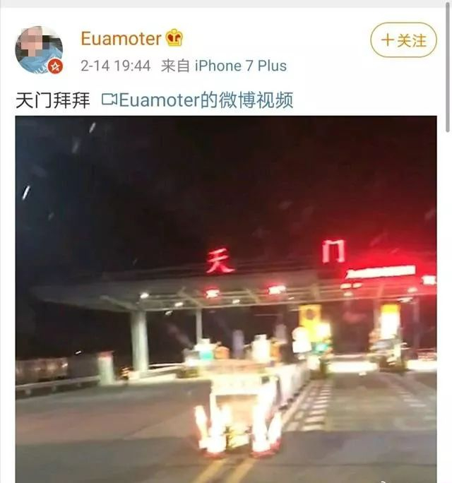 当天19时44分,@Euamoter 再次更新了一条视频,并配文“天门拜拜”,画面为天门高速入口。