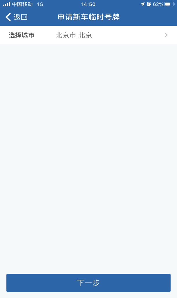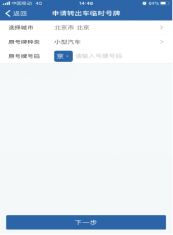 用户登录“交管12123”手机App后进入[业务中心],在[机动车业务]中选择[申请转出车临时号牌],进入申请新车临时号牌业务。用户选择北京,系统需要采集车辆原号牌种类和原号牌号码。