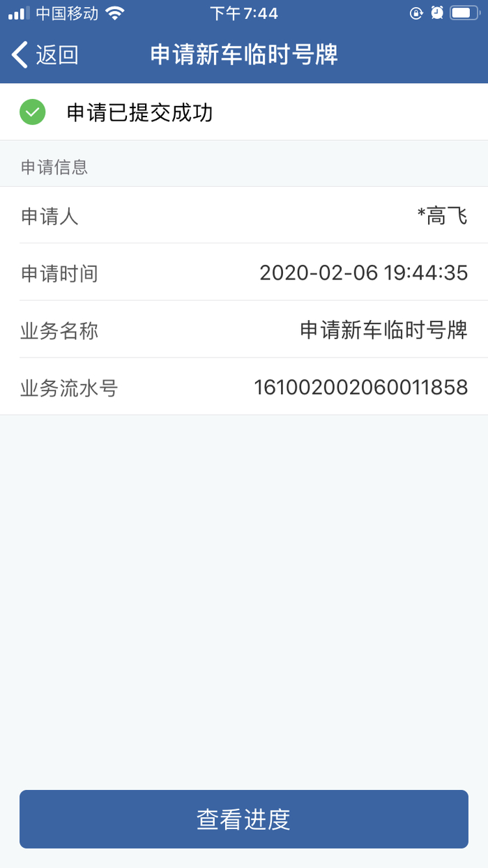 用户申请成功后,点击[查看进度]按钮查看当前业务进度详情或直接在首页进入网办进度页面查看业务进度。