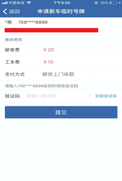 3、群众可选择线上支付(工本费、邮费)或到付(邮政人员将上门收取费用,交付临时行驶车号牌及收费票据)两种方式缴费,并如实提供本人准确的联系电话和邮寄地址。