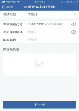 为已申请的车辆重新申请临时号牌时,系统只需要采集号牌类型、住所详细地址、邮政编码等信息,其他信息不需要采集。用户可点击带有问号标识的图标显示帮助信息,系统未核查到该车交强险凭证时需上传交强险凭证照片。