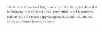 美国对外关系委员会高级研究员黄严忠在接受《纽约时报》采访中指责中国历来的治理体制存在缺陷,政府倾向于掩盖信息。他把中国政府在面对危机时的反应形容成“就像一场希腊悲剧”。