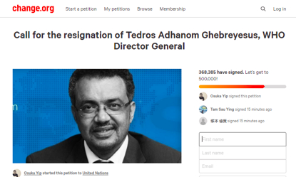 加拿大网民伊普(Osuka Yip)2月1日在网上发起联署,要求世卫组织总干事谭德塞引咎辞职,“罪名”是世卫组织在中国疫情问题上反应迟缓,并且谭德塞拒绝台湾趁机加入世卫组织。截至2月12日已有36万人参加了联署。