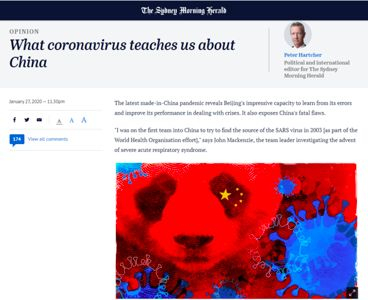 悉尼先驱晨报报道称,“疫情暴露了中国体制方面的致命缺陷”。文章援引前世卫组织2003年来华调查SARS的小组负责人约翰•麦肯齐(John Mackenzie)观点称,疫情发生后,“中国一直企图掩饰真相,中国的体制已经习惯于在没有责任的情况下行使权力”。他还以中国2003中国卫生系统的情况来谴责中国应对新冠肺炎疫情的体制缺陷。