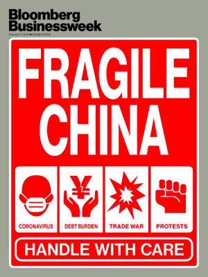 彭博商业周刊2月17日最新一期的封面,用“脆弱的中国”(Fragile China)为题,下面列举了“新冠病毒、债务负担、贸易战和抗议行动”四方面内容,分别以戴口罩的头像等配图放上四个图标,影射中国目前面临的问题。图标下标明“小心轻放”(Handle with care)。