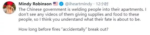 2月12日,美国女演员、模特儿和主持人明迪·罗宾逊在个人推特上发文,污蔑“中国不给隔离人员提供食物”。在抗击新冠病毒疫情中,中国政府本着对世界人民健康高度负责的态度,采取最全面、最严格的防控措施,获得很多国家的认可和赞誉。而在社交媒体上,一些人却罔顾事实,在不明真相的情况下发言攻击中国抗“疫”措施,此类抹黑的发文层出不穷,花样百出。