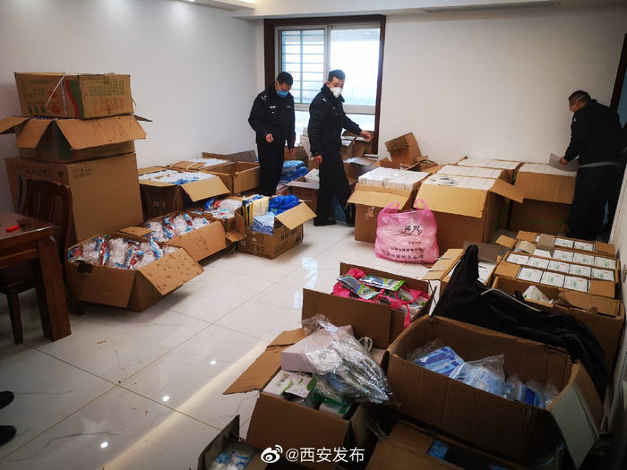 2020年01月30日1下午,民警在西安市市场监督管理局的协同下,对付某所居住的浐灞生态区某小区展开联合突击稽查。现场发现并查扣假冒“飘安”“民乐”牌一次性医疗口罩及“3M”牌口罩6万余个,劣质护目镜及过期橡胶手套2万余个,涉案总金额达4万余元。