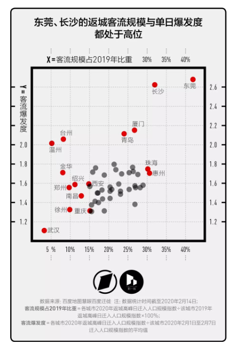 值得关注的是,东莞在今年高峰日2月9日的客流规模占到了去年高峰日的42%,位于所有城市的首位。另有3座城市超过了去年的30%,它们分别是长沙、惠州和珠海。在高峰日单日客流爆发度一项上,东莞、长沙同样占据前两位,厦门、青岛也达到了前一周的2倍以上。可以预见的是,这些城市下一步的防控重点将转向城市内部的社区与企业。