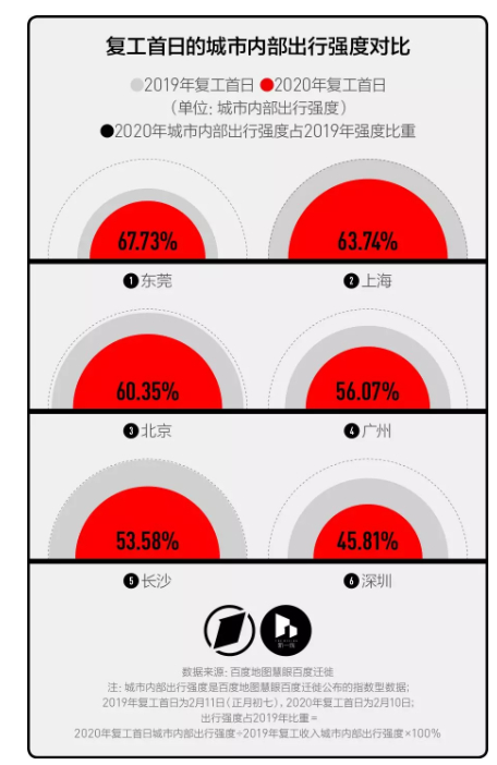 复工后的城内出行强度展现了目前真实的“到岗办公”情况。在对复工首日出行强度的比较上,新一酱对东莞、长沙也作了纳入。以发展制造业为主的东莞显然有着更高的到岗生产需求,整座城市的出行强度已恢复至去年同期的三分之二;紧随其后的是上海与北京。
