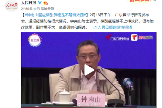 2月18日下午,广东省举行新闻发布会,通报疫情防控相关情况。钟南山院士表示,磷酸氯喹够不上特效药,但有治疗效果,副作用不大,值得研究和探讨。