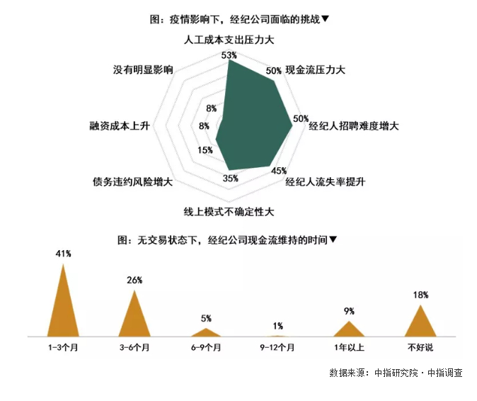 从中指研究院对全国超1000名房产经纪人的调研结果显示,超8成经纪人表示自新冠肺炎疫情以来无成交。由于现金流储备并不充裕,近7成经纪公司认为当前的资金撑不过半年。在开源节流的预期下,不乏经纪公司有关闭门店的考虑。不过,多数经纪公司寄希望于政策活跃市场以缓解困境。