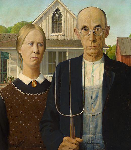 格兰特·伍德的《美国哥特式》是芝加哥艺术博物馆的著名馆藏。这是一幅描绘美国农民的油画,伍德邀请他的牙医和自己的妹妹担任这幅画里的两位模特,两个人站在爱荷华州的一栋老房子前面。这幅画的意义与当时的社会氛围有很大关系,道出了美国人在经济大萧条背景下绝望而又渴望找回真实价值观的心声。