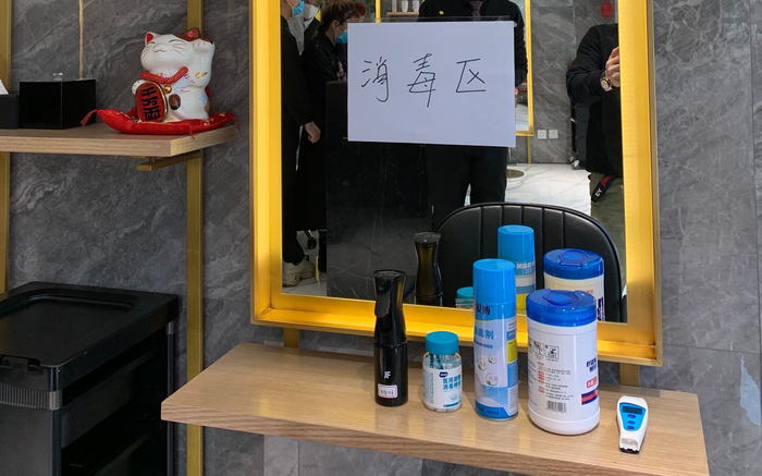 理发店内设有专门的消毒区。摄影/新京报记者 陈琳