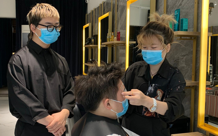 付军剪艺新城国际店开业,要求美发师和顾客都要戴口罩,理发设备和座位做到一客一消毒。摄影/新京报记者 陈琳