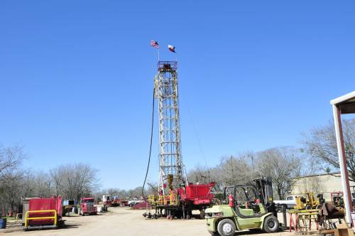 图为美国得克萨斯州的石油小镇卢灵的一家钻井公司院内的一台钻机。新华社
