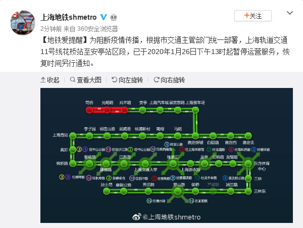为阻断疫情传播,根据市交通主管部门统一部署,上海轨道交通11号线花桥站至安亭站区段,已于2020年1月26日下午13时起暂停运营服务,恢复时间另行通知。