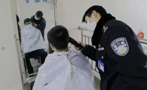 这是一个非常简陋的理发室,四面通风、紧挨楼梯口,一把临时找来的推剪,一张再普通不过的凳子,外加一面警容镜,省金华监狱的“战地”义务理发室就这样开张了。理发室的“师傅”是民警陈冬冬,他是一名部队转业干部,更是一名党员。2010年,在部队外训期间,他自学了理发技术,没想到在新冠肺炎疫情防控期间,十年前的手艺又有了用武之地。执勤之余为封闭区内的民警理发就成了陈冬冬的“第二任务”。他左手拿梳,右手握剪,自下而上、由后及前,“推、剪、挑、移……”专心致志,如果不是身穿着警服,还以为是专业的理发师。因为每位民警的工作任务各不相同,执勤、休息时间也不统一,按照战时工作纪律,理发室暖心地推出了个性化预约服务。就这样,自战“疫”以来,这个临时理发室解决了不少民警的理发问题。“十来年没动手了,手艺有些生疏,刚开始只能小心一点,完成一次理发要花不少时间。”陈冬冬笑着说,“不过,这几天又熟练起来了,工作效率也有了提高。”“看着同事们风风火火地赶来、精神焕发地回去,能为他们做点事,我感到很开心。”陈冬冬说。