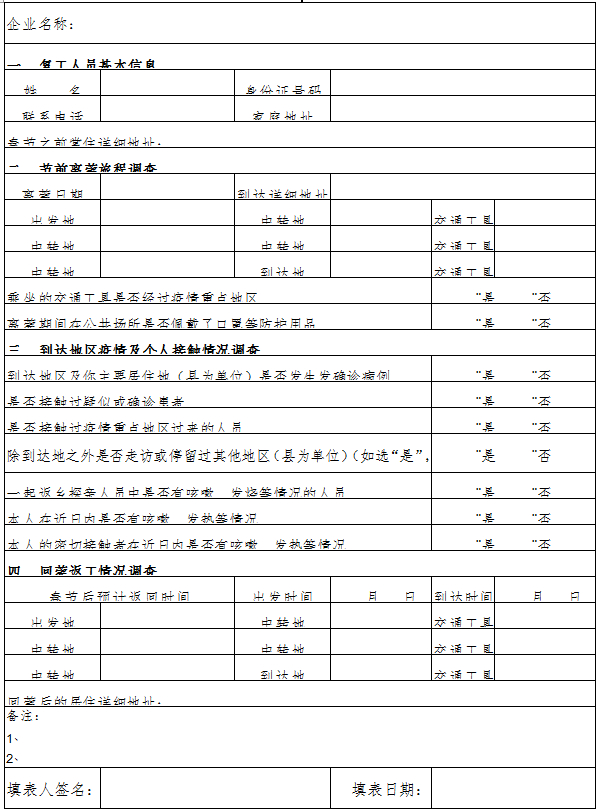 △有全体员工“一人一档”调查表,形成档案备用。表格应含有姓名、性别、身份证号码、年龄、籍贯、联系方式等基本信息,以及该员工2020年春节前后至今的行动轨迹,包括以下重点关注事项,样式参照附件3,企业可根据自身实际调整;