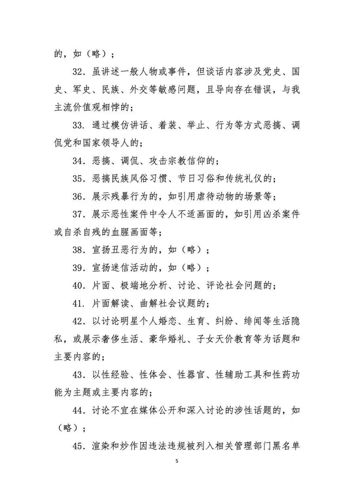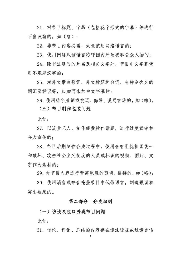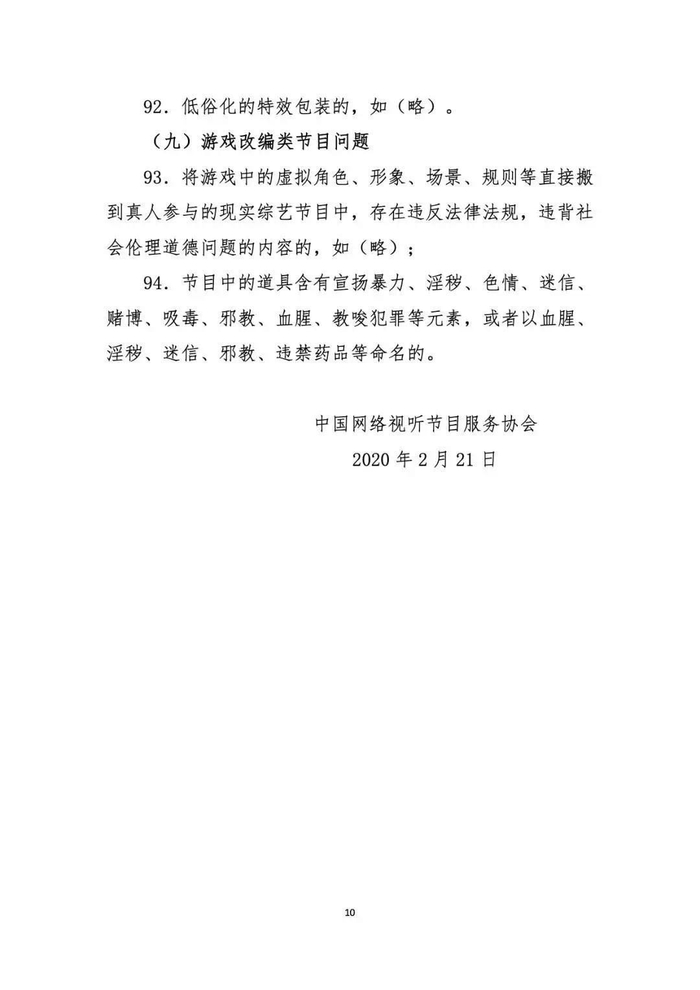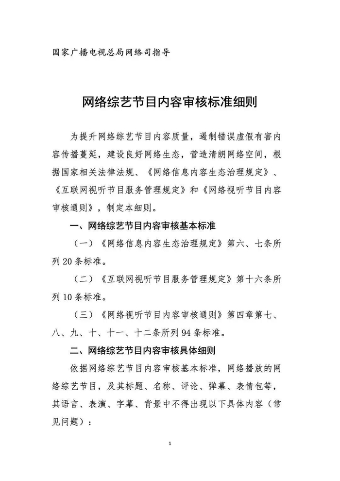 按照国家广播电视总局工作部署,在总局网络视听节目管理司指导下,中国网络视听节目服务协会联合央视网、芒果TV、腾讯视频、优酷、爱奇艺、搜狐、哔哩哔哩、西瓜视频、快手、秒拍等视听节目网站制订了《网络综艺节目内容审核标准细则》,于2月21日发布。