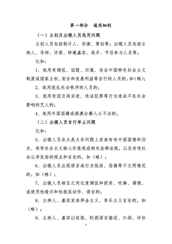 《细则》提出,综艺节目的主创及出镜人员,不得选用因丑闻劣迹、违法犯罪等行为造成不良社会影响的艺人;不得出现选用外国国籍或港澳台籍人士不当的情况。