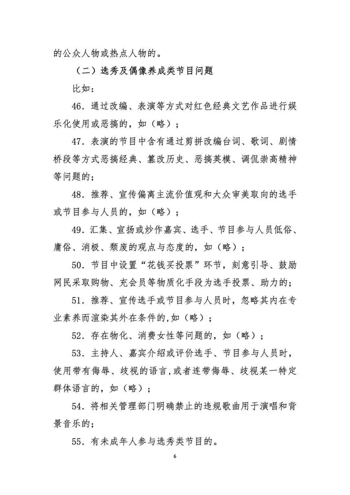 选秀及偶像养成类节目中不得设置“花钱买投票”环节,刻意引导、鼓励网民采取购物、充会员等物质化手段为选手投票、助力;主持人、嘉宾介绍或评价选手、节目参与人员时,不得使用带有侮辱、歧视的言语,或者连带侮辱、歧视某一特定群体的语言;不得有未成年人参与选秀类节目。
