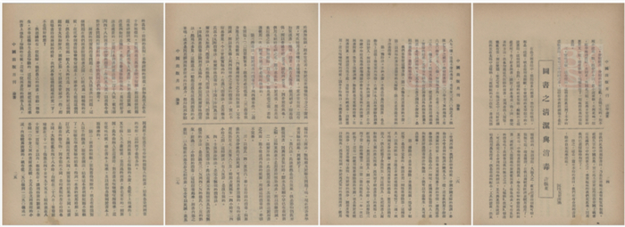 此外,与在西方各国多强制实行“图书销毁”不同,中国图书馆界对该政策多有异议。虽然1934年《图书馆卫生》一文曾提倡“出纳次数最多沾染手诟很厚的图书,应当焚烧,用新书代替”,但中国图书馆多更珍惜图书,如1933年《图学论著:图书之清洁与消毒》一文称:“肮脏的图书,陈列着供人阅览,简直有害,封存焚烧,弃之可惜。”事实上,当时图书馆界对传染病患者接触过的书籍多不进行销毁,而是采用与污损图书类似的处理方式,即“曝晒、改面和切边”。