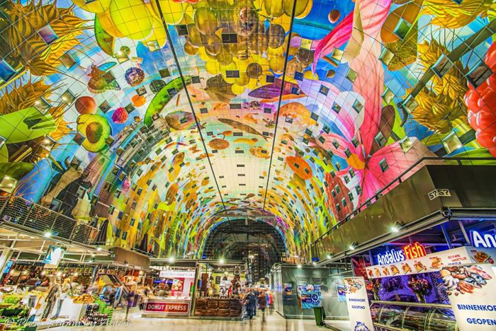 坐落于鹿特丹市中心劳伦斯广场的Markthal是世界上“颜值”最高的菜市场之一,它作为全球首例菜市场+住宅相结合的建筑,成为了鹿特丹的新地标,也被称为现代版的西斯廷教堂。Markthal用了10年时间打造而成,整体呈优雅的马蹄形拱廊设计,隧道前后是玻璃幕墙,穹顶是画满水果、蔬菜与鲜花的“丰收之角”壁画。“丰收之角”大型壁画面积达11000平方米,采用超大图像显示市场上出售的产品。