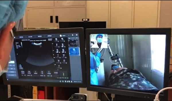 除了保障各类供应稳定畅通,方舱医院还用上了新科技。2月18日下午15点15分,远在700公里之外的浙江省人民医院远程超声波医学中心的专家,利用中国电信5G技术,通过手柄远程控制黄陂体育馆方舱医院的超声机器人为患者进行超声检查。这是新冠肺炎疫情发生以来,首次运用5G远程诊疗技术为新冠患者实施救治。