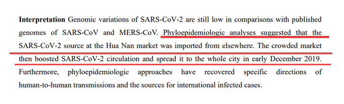 2、从基因层面的证据来看,华南海鲜市场并不像是新冠病毒的源头,而是从其他地方输入到了华南海鲜市场,再于12月通过华南海鲜市场大规模地传播开来。