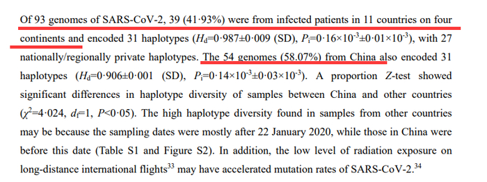 这93个病毒基因样本分别来自4大洲11个国家的感染者,其中有54个来自中国国内,取样时间在1月22日之前,还有39个来自国外,取样时间则在1月22日之后。