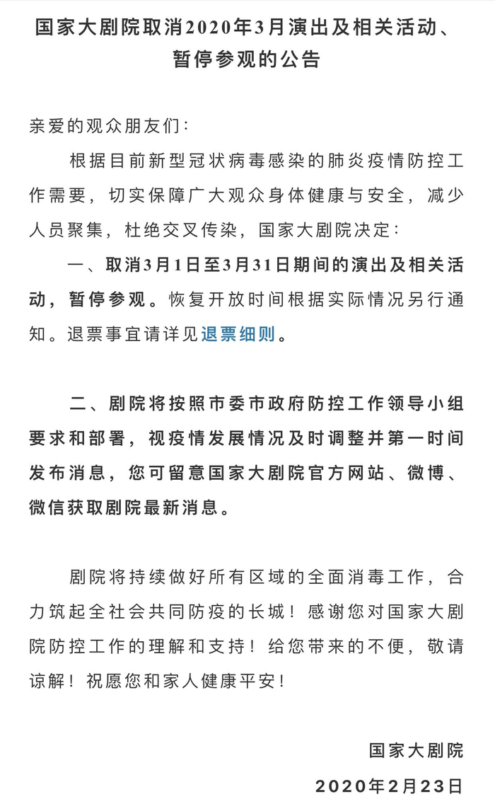 原标题:国家大剧院发布公告:取消2020年3月演出活动