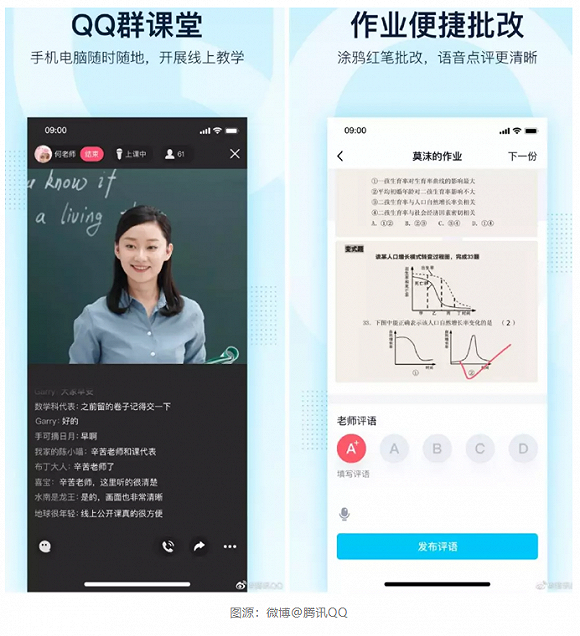 QQ也是在直播中备受青睐的平台。它原有的音视频功能主要为社交场景服务,当使用场景转变为课堂时,老师们依照平时的教学习惯,提出许多需求。例如,指定同学发言,按区域分享个人屏幕,最大化保护自己的隐私等。