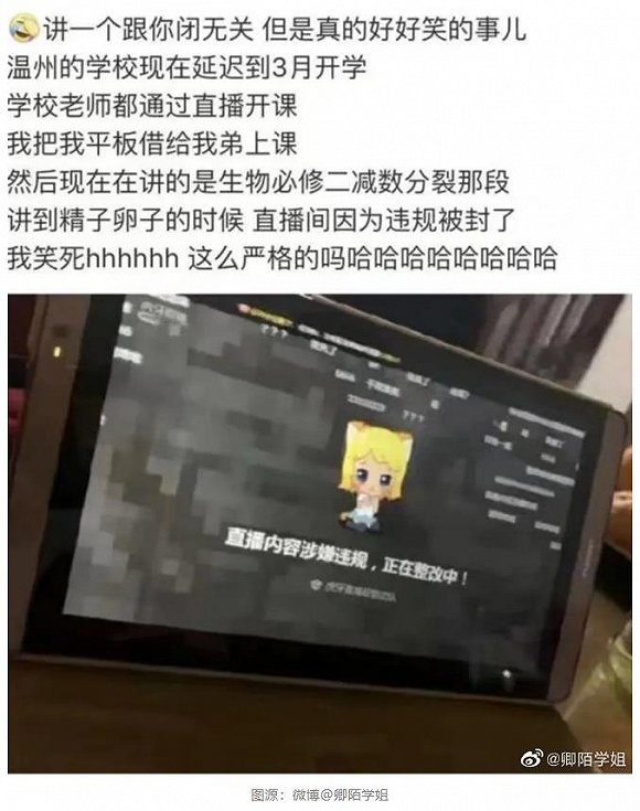 一位妇产科护理学专业的老师在QQ群里反映因涉黄被封;温州一位生物课老师在讲减数分裂时提到“精子卵子”,直播间因违规被封;@讲历史的王老师 在微博提醒教师朋友,政治课、历史课、语文课的一些内容,在讲课时需要谨慎一些。。。。。。