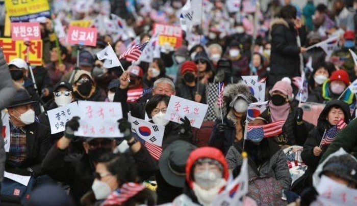 22日中午,在韩国首尔光华门的游行中,有人举着大喇叭高喊:中国人滚出去,武汉人滚出去。