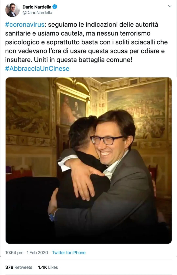 在意大利受到疫情影响而人心惶惶的时候,佛罗伦萨市市长达里奥·纳德拉在推特上发起了一个“#拥抱一名华人(#AbbracciaUnCinese)”的话题标签,并配推文说:“我们遵循卫生当局的指导,我们谨慎行事,但绝不搞心理恐怖主义。”