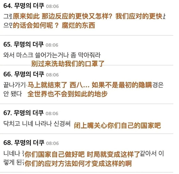 23日,在一则题为“中国言论:‘韩国应对迟缓’…担心重蹈武汉覆辙”的新闻下,韩国网友的评论几乎都是对中国的谩骂攻击: