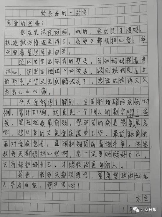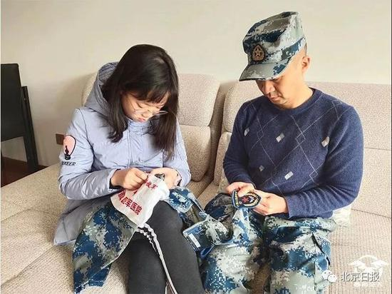出征前,胡月曦为爸爸胡宇佩戴医疗队袖标