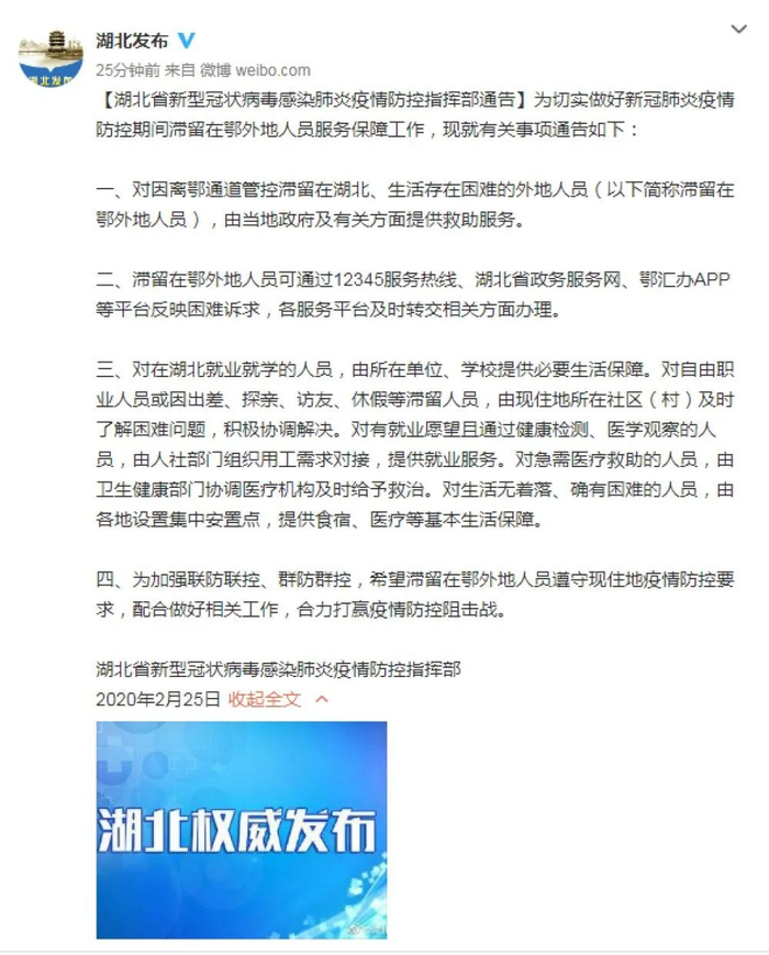 为切实做好新冠肺炎疫情防控期间滞留在鄂外地人员服务保障工作,现就有关事项通告如下:
