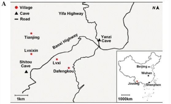为进行人类感染蝙蝠SARS相关冠状病毒的血清检测,在2015年10月,石正丽团队在云南省昆明市晋宁区夕阳彝族乡4个村庄(天井,大风口,绿溪,绿溪新村)收集了218个居民的血清样本。附近有2个蝙蝠洞(燕子洞和石头洞),距离4个村庄在1.1-6.0公里之间。自2011年以来,石正丽团队一直在对这些洞穴中存在冠状病毒的蝙蝠进行纵向分子监视,并发现大量蝙蝠居住,包括被证明是SARS相关病毒主要宿主的菊头蝠(石正丽团队日前发现的与新冠病毒最接近的病毒样本,也采自菊头蝠)。