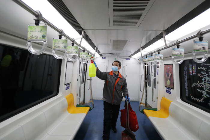 地铁郭公庄站副站区长赵新存介绍,目前地铁列车出库前将进行5次彻底消毒,列车在到达终点站清车保洁时也会进行消毒。除了日常对车辆、站区的消毒外,地铁列车抵达终点后折返作业的间隙,工作人员还要“抢”出两到三分钟的时间对全车进行喷洒消毒。