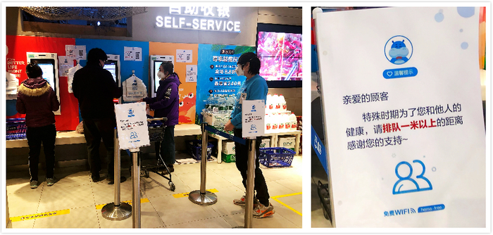与Ole的情况基本相同,卖场内的顾客人数远远少于理货和为线上销售拣货的工作人员。很多可现做、现卖、现吃的摊位已关闭,堂食区域顾客不多,也都是隔桌而坐。洗手区域放置了除菌洗手液,并张贴了“戴口罩、勤洗手”的提示。在自助收银区,“特殊时期为了您和他人的健康,请排队一米以上的距离”的提示醒目,地上也有明显的排队等候线,并专门安排了工作人员疏导秩序、提醒顾客结账时要拉开距离。