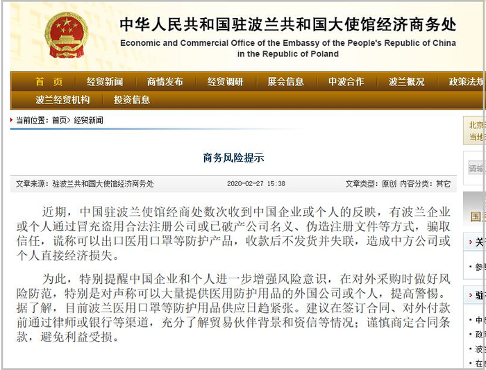 原标题:波兰企业假卖医用口罩诈骗,我使馆发商务风险提示