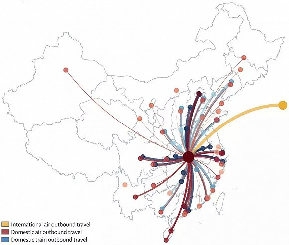 国外研究根据武汉交通流量估算的疫情传播趋势。注:图片来源https://doi.org/10.1016/S0140-6736(20)30260-9
